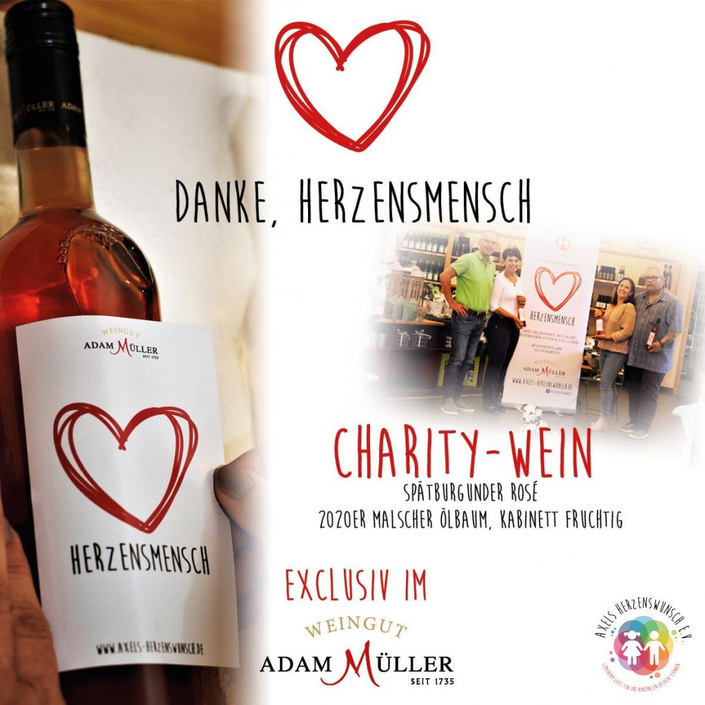 Die ersten 180 Flaschen wurden uns komplett für dieses Projekt durch das Weingut Adam Müller gespendet - von jeder weiteren verkauften Flasche fließen 2,- Euro in den Axels Herzenswunsch e.V. - hilf auch Du mit "a bottle today".